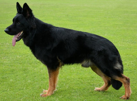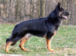 stehender ausdrucksvoller Rüde mit kräftigem Kopf und dunklem Auge , hoher Widerrist , gerade Rücken , Kruppe ist etwas kurz und betont geneigt, gute Vor und Hinterhandwinkelung , ausgeprägte