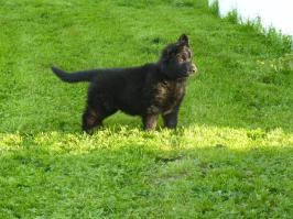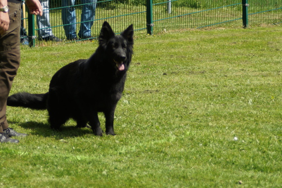Brustbildung , gerade Front, bei guter Gleichgewichtslage zeigt er gute raumgewinnende Gänge , wobei der Nachschub etwas kraftvoller sein könnte , temperamentvolles sicheres Wesen , TSB ausgeprägt ,